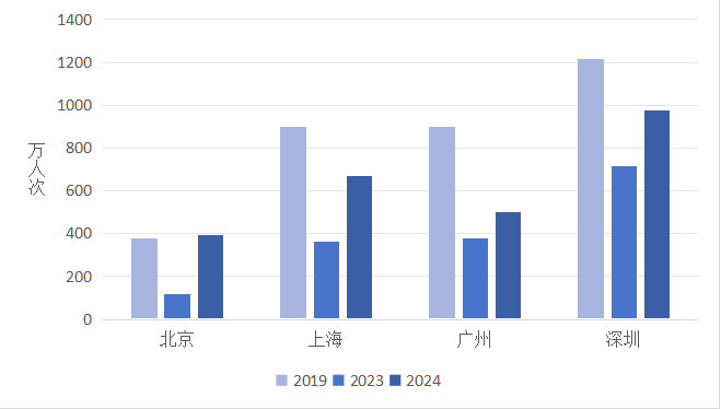 除了四个一线城市,课题组根据2019年入境游客接待量位居前25的城市进行检索,共采集到12个城市的相关统计数据。这12个城市包括:重庆、成都、杭州、西安、昆明、南京、苏州、厦门、桂林、张家界、三亚和珠海。其中的7个城市公布了2024年全年的入境游客接待数据,3个城市公布了2024年前三季度的数据,2个城市公布了2024年上半年的数据。